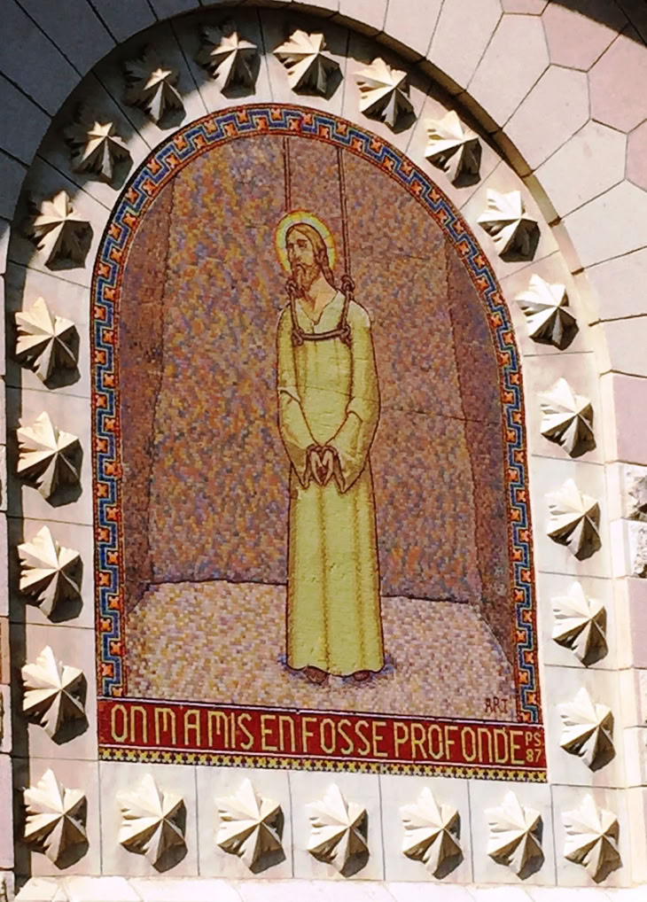 There is a mosaic depicting Jesus in a rope harness is on the outside south wall of the church.