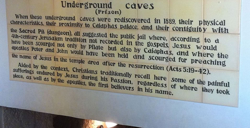 You may wish to follow up Irene’s reflection by reading more: Rev. Julie Schendel’s ‘The Sacred Pit’ (April 6, 2012) offers a powerful account of her visit to Caiaphas’ house. …”The pit consisted of a small area, perhaps 15 by 15 feet square, maybe 20 feet deep. No windows. No doors. No lights. The only way in or out was for a prisoner to be lowered by rope, tied around their shoulders and chest, lowering them in through the hole in the roof. Lowering them into the cold, empty darkness of the pit. Alone. Forgotten.