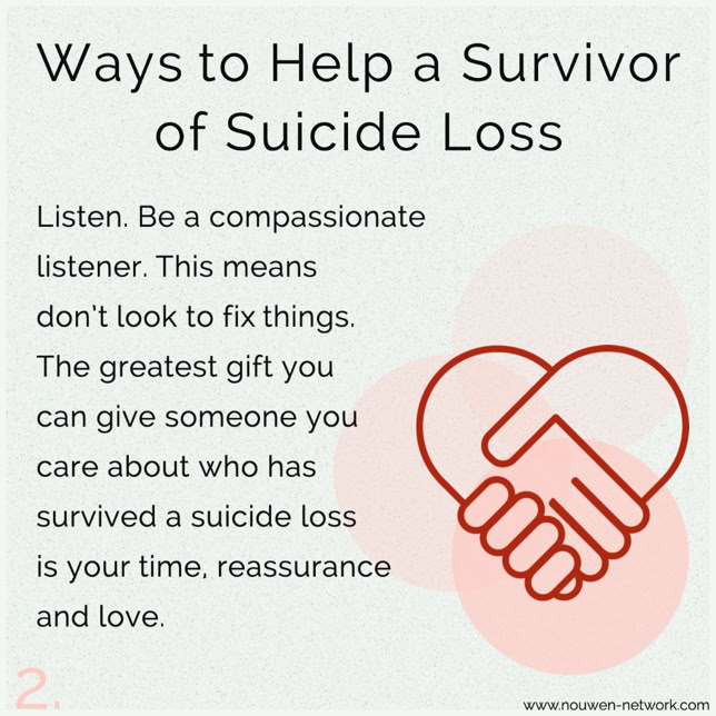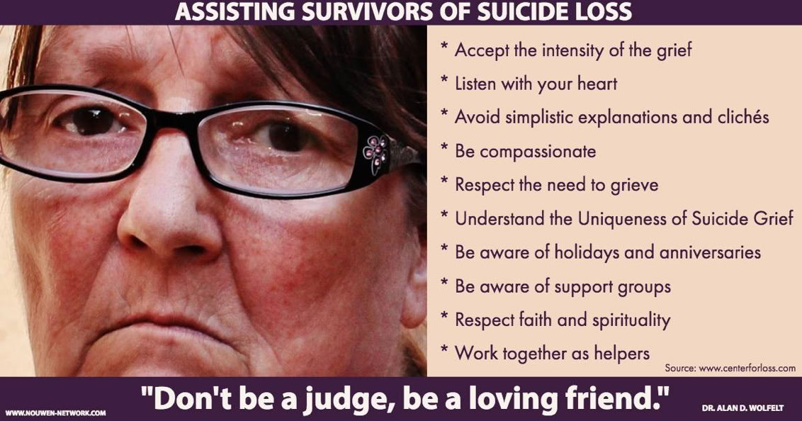 Survivors may also need to explore how religion may have complicated their grief. They may have been taught that persons who take their own lives are doomed to hell. Your task is not to explain theology, but to listen and learn. Whatever the situation, your presence and desire to listen without judging are critical helping tools."