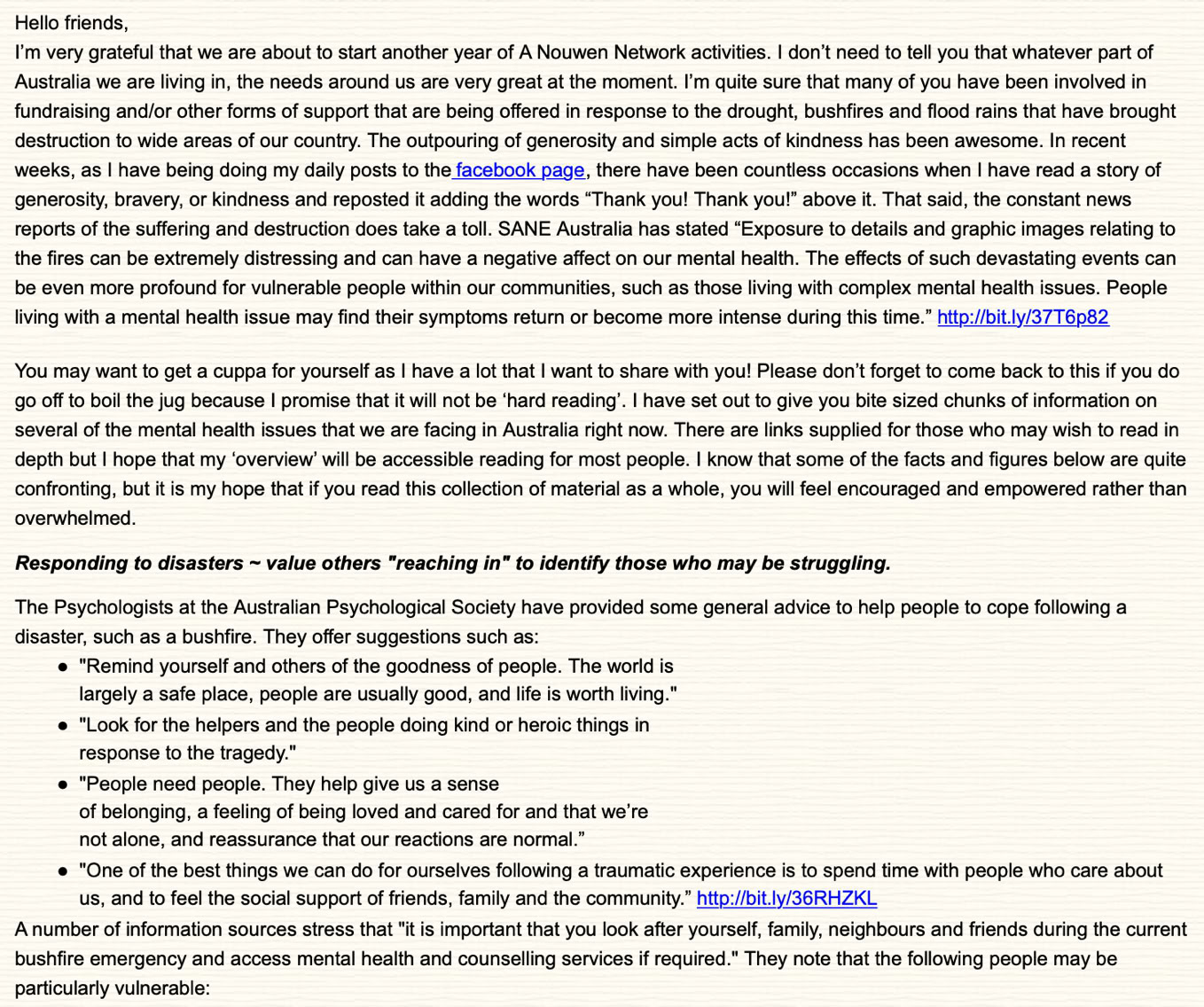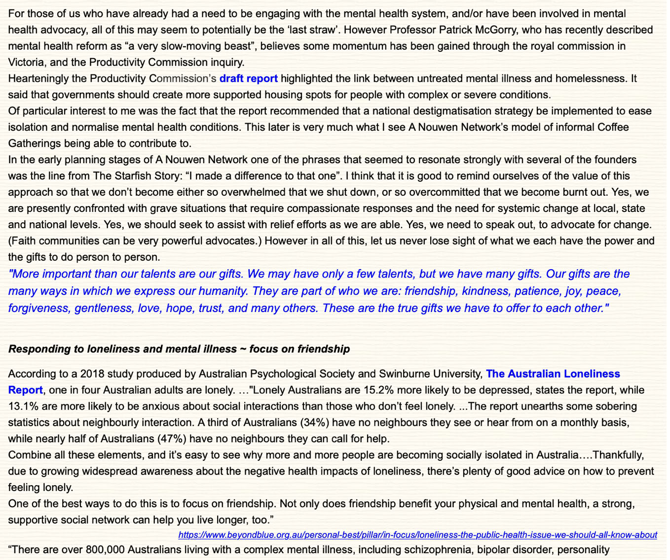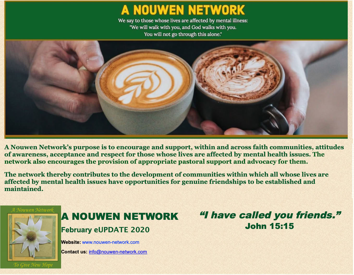 The blog space here on Hopelinks will be the new location for my reflections on mental health related issues and events. For archive purposes, and for the benefit of present readers who have never read one of the Nouwen Network e-updates, I have included below an image of the last message that I sent out while A Nouwen Network was active. (I have not included the regular section on Coffee Gathering locations and upcoming Awareness Days.) These e-Updates were sent out several times a year for more than a decade. The format evolved as the Network grew, but I always began with a passage from Henri Nouwen that I had been reflecting on.