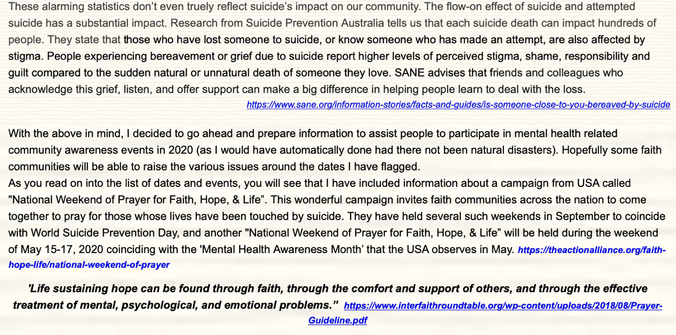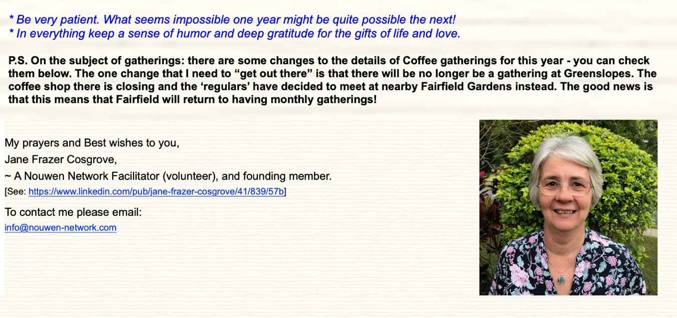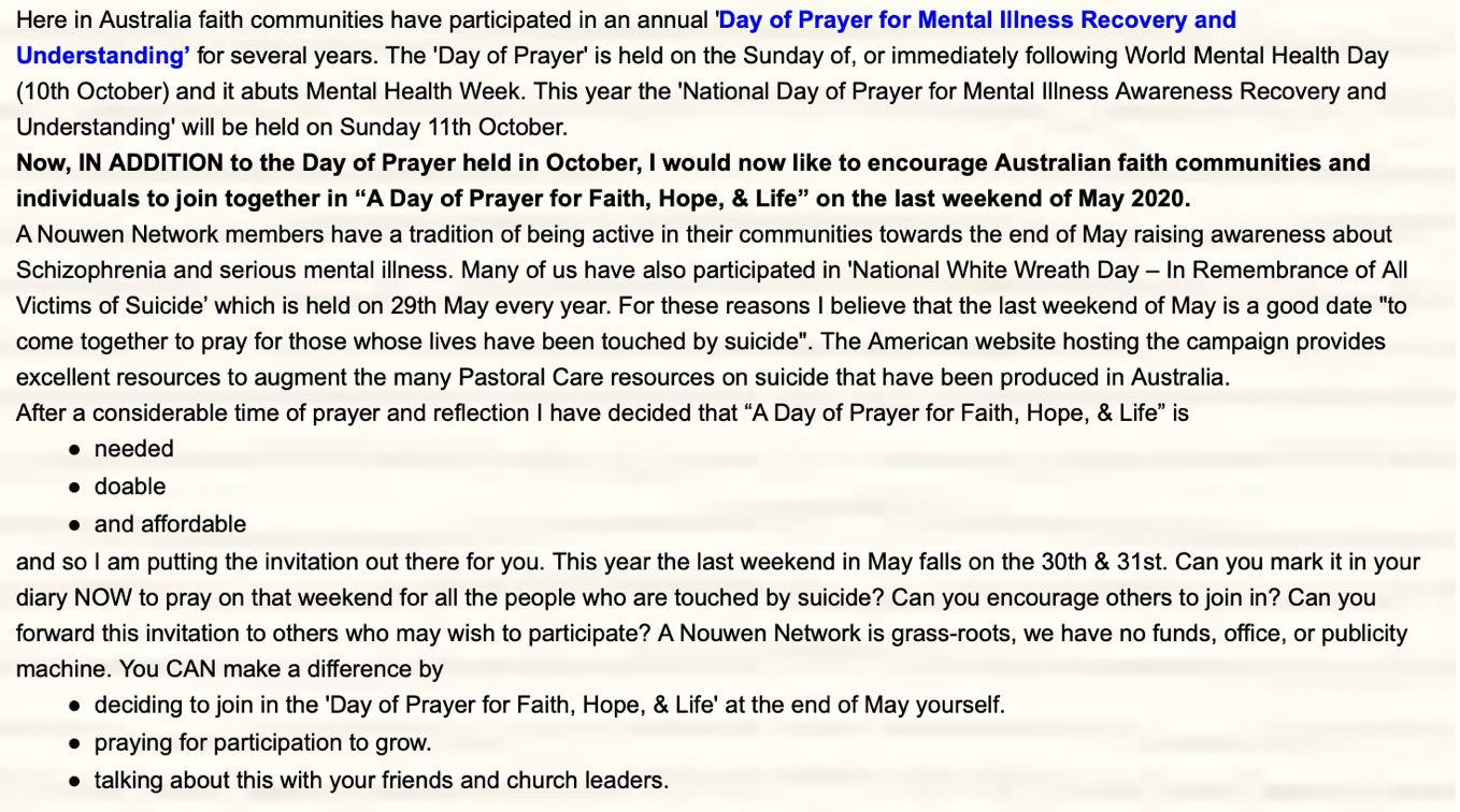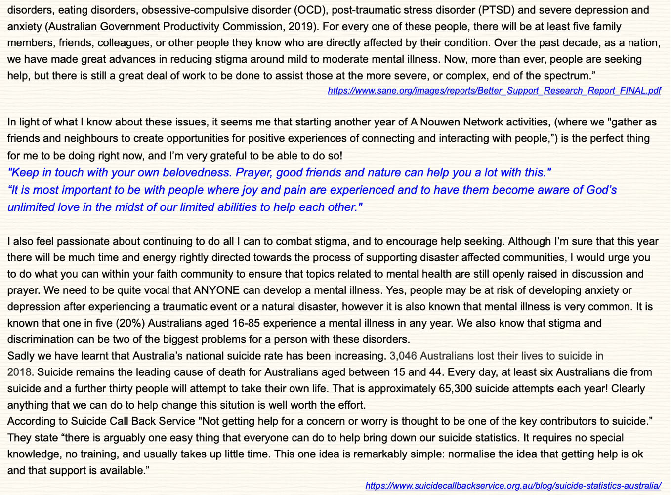 The blog space here on Hopelinks will be the new location for my reflections on mental health related issues and events. For archive purposes, and for the benefit of present readers who have never read one of the Nouwen Network e-updates, I have included below an image of the last message that I sent out while A Nouwen Network was active. (I have not included the regular section on Coffee Gathering locations and upcoming Awareness Days.) These e-Updates were sent out several times a year for more than a decade. The format evolved as the Network grew, but I always began with a passage from Henri Nouwen that I had been reflecting on.