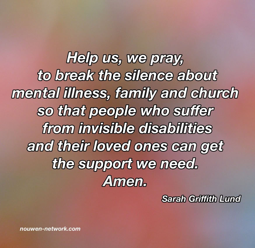 For example, when a loved one has a difficult episode a caregiver may need to take time off from work. So we pray employers would be understanding and supportive. There can, sometimes, be entanglements with the legal system. So we pray for wisdom and resources to hire competent attorneys and for merciful judges. In addition, we always pray for healing and for sustaining faith.”
