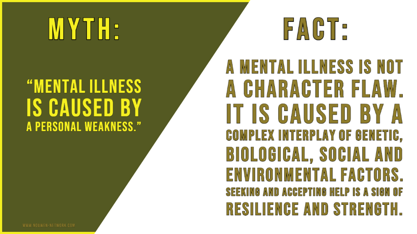 Fact: A mental illness is not a character flaw. It is caused by a complex interplay of genetic, biological, social and environmental factors. Seeking and accepting help is a sign of resilience and strength.