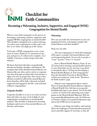 Checklist for Faith Communities: Becoming a Welcoming, Inclusive, Supportive, and Engaged (WISE) Congregation for Mental Health developed jointly by the Interfaith Network on Mental Illness and the UCC Mental Health Network.This checklist is designed to be a mirror showing you where your congregation is today and a window to see where you might go in the future.