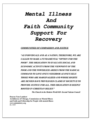 Mental Illness And Faith Community Support For Recovery - Communities of Compassion and Justice by Deacon Tom and Rita Lambert. This is a booklet describing the issues facing persons with mental illness and their families and providing ideas for churches to minister to them. From: Mental Illness Ministries