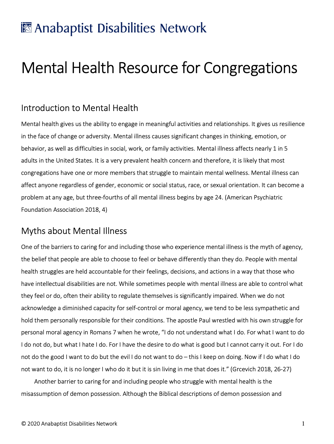 Mental Health Resource for Congregations is produced by Anabaptist Disabilities Network
