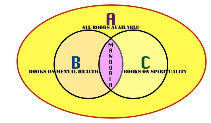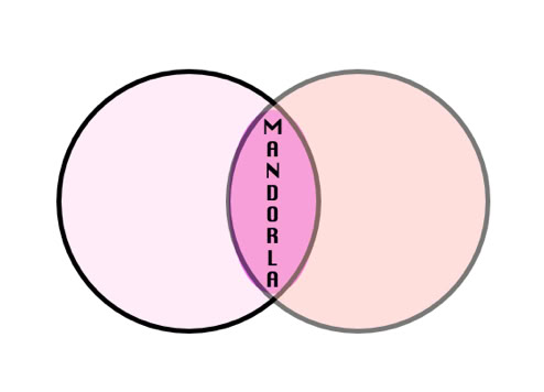 The Mandorla symbol is a little less well known. A mandorla is an image of that almond-shaped segment that is made when two circles partly overlap. “Mandorla” literally means “almond” in Italian. The image of the mandorla represents union, and in symbolic logic, this figure represents the intersection of two sets.