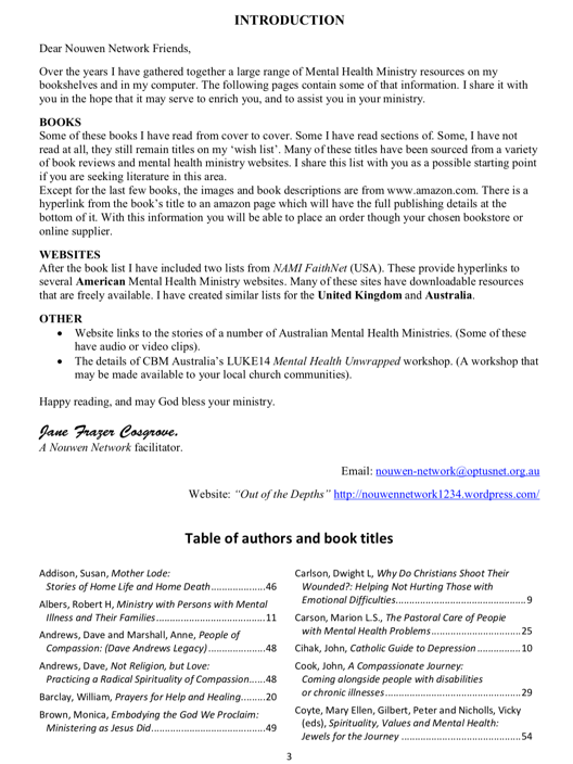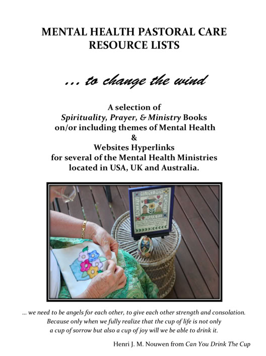 Another ‘myth busting’ response was the creation of the Mental Health Pastoral Care Resource List … ‘to change the wind’. This resource offers a selection of Spirituality, Prayer, & Ministry Books on/or including themes of Mental Health. It also provides Websites Hyperlinks for several of the Mental Health Ministries located in USA, UK and Australia.