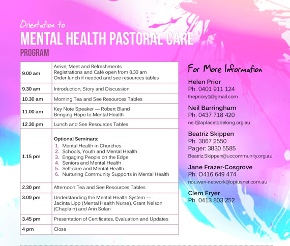 …”This day will involve workshops – not lectures. The day is an orientation to mental health involving far more than learning simple or technical approaches. We will acknowledge the need for shared vulnerability, and connecting with the personal, spiritual, creative, hopeful and artistic dimensions of our work as we engage with people who are grappling with their mental and emotional health. We invite you to come, to listen, to reflect, to meet, to discuss – and to take what parts of the day might be useful or relevant to your role.”