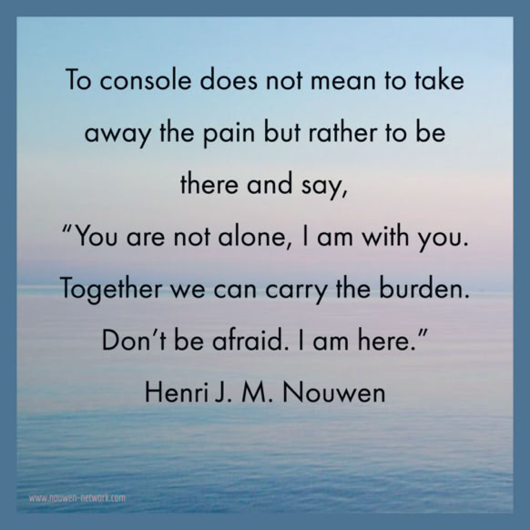 To console does not mean to take away the pain but rather to be there and say, “You are not alone, I am with you. Together we can carry the burden. Don’t be afraid. I am here.” That is consolation. We all need to give it as well as to receive it.