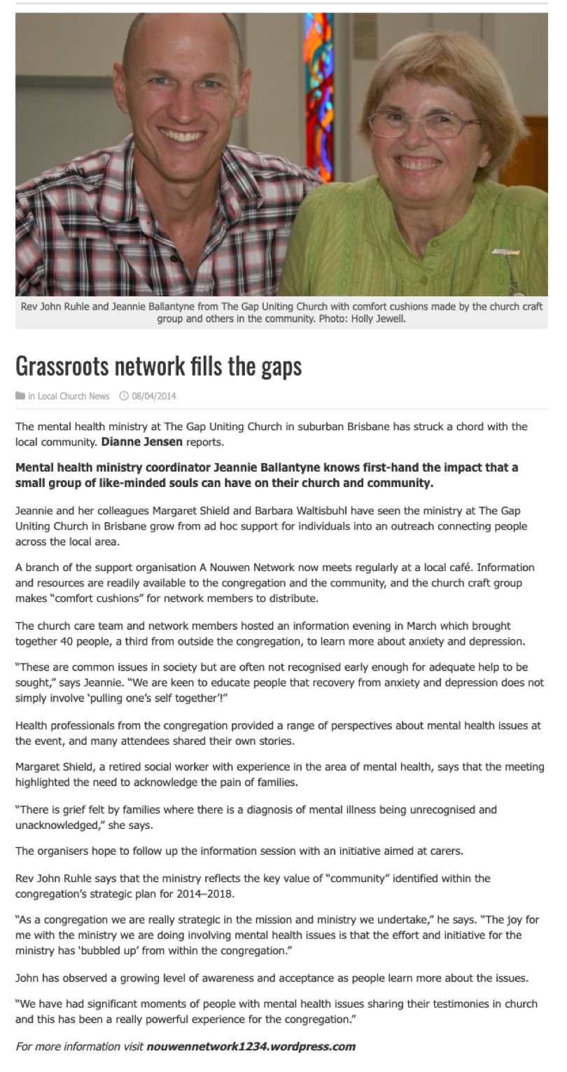 “A branch of the support organisation A Nouwen Network now meets regularly at a local café. Information and resources are readily available to the congregation and the community, and the church craft group makes “comfort cushions” for network members to distribute.