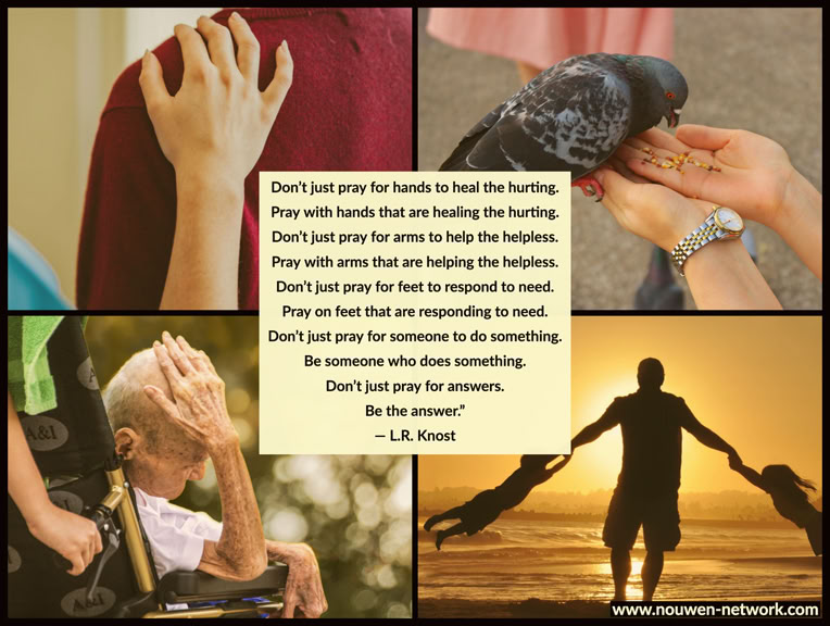 Don't just pray for hands to heal the hurting. Pray with hands that are healing the hurting. Don't just pray for arms to help the helpless. Pray with arms that are helping the helpless. Don't just pray for feet to respond to need. Pray on feet that are responding to need. Don't just pray for someone to do something. Be someone who does something. Don't just pray for answers. Be the answer.”